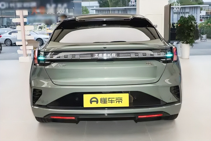 极氪001的尾部延续简洁思路。贯穿式尾灯内部采用多段LED光源结构,点亮后层次分明,点阵式发光单元在夜间具有很高辨识度。尾门线条略微上扬,结合小型扰流板形成自然过渡,进一步优化尾部气流分离效果。品牌Logo被简化为“ZEEKR”英文标识,嵌入在灯带中央,取消传统标志元素,整体视觉更干净。Ultra+版本在尾部加入碳纤维尾翼与扩散器造型装饰,搭配熏黑下包围,让尾部层次更加立体。高位刹车灯隐藏于尾翼下方,在保证功能性的同时保持整洁造型。整体尾部的比例依旧宽大厚实,没有浮夸的线条,却通过光影变化体现出车身的力量感。