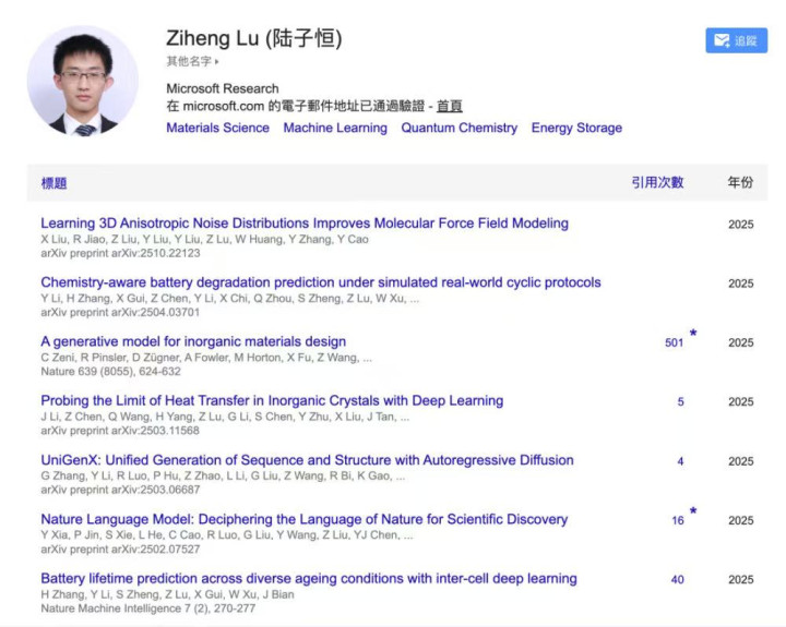 陆子恒博士近年参与的材料与科学计算相关研究论文,包含无机材料生成、热传输模拟、电池退化预测等方向。(图源:Google Scholar)