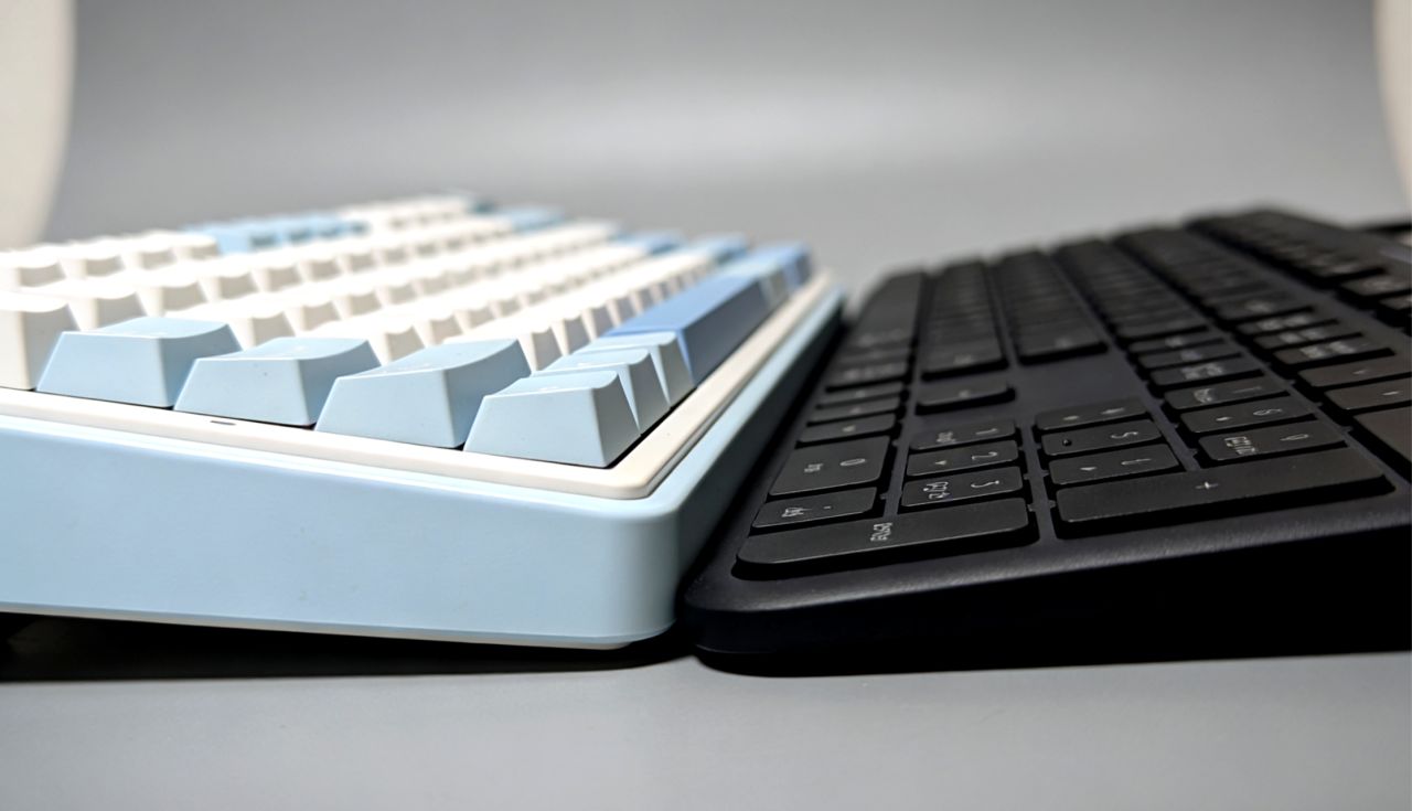 我来实际用一下键盘一上手真的很有趣 它采用剪刀脚矮轴,按键的键程偏短,但回弹软且干净,敲击安静,长时间码字手腕压力小,和笔记本键盘手感接近,我个人认为更适合文书、办公场景。键帽做了轻微凹面贴合指腹,定位更稳。而且最直观的一点,就是薄。